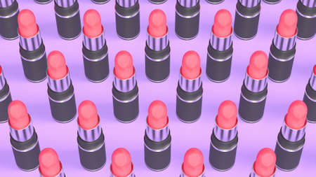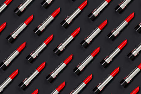 Glamorous pattern of red lipsticks on a black background. 3d illustration. Beauty style. Lipsticks are located at an angle lying.