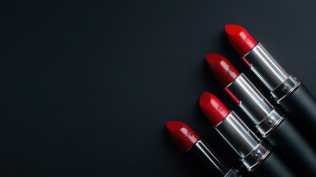 Captivating image featuring four elegant red lipsticks placed on a sleek black background. Perfect for beauty and makeup promotions, showcasing vibrant colors.