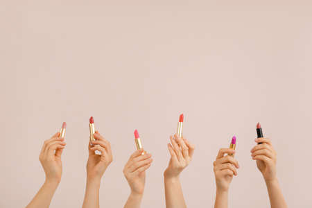 Female hands with lipsticks on color background