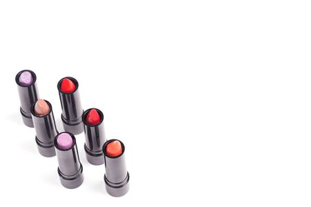 Various cut lipsticks on white background. Makeup product samples