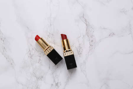 Red lipsticks on marble surface. top view