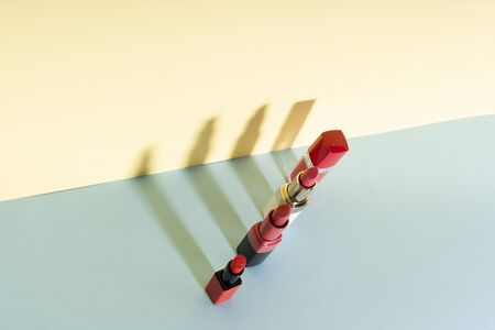 Set collection of red lipstick product on pastel wall.