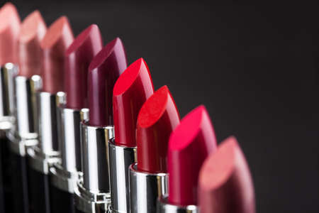 Women beauty products, luxury fashion and makeup concept with a row of lipstick tubes in a line on dark background with dramatic lighting and copy space