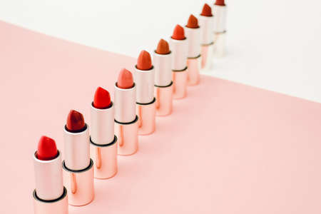 Lipstick different colors, shades options. Cosmetics on nude background. Beautiful examples of lipsticks, pink and red. Fashion