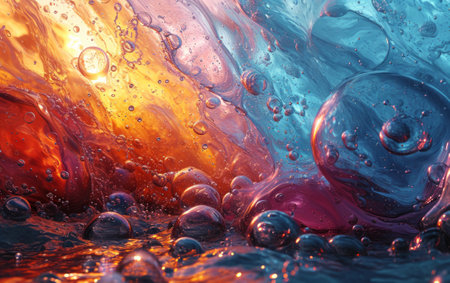 Macro view of swirling liquid with vibrant blue and orange hues and suspended bubbles.