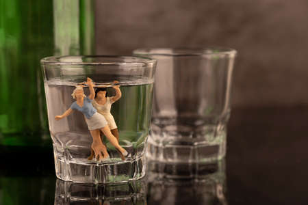 A transparent cup of water, splashes of water from ice thrown into a cup