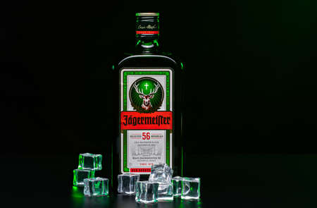 Rostov, Russia, July.2019. A bottle of Jagermeister, a German digestif, the flagship product of Mast-Jagermeister SE, on dark background with ice cubes. Editorial use only