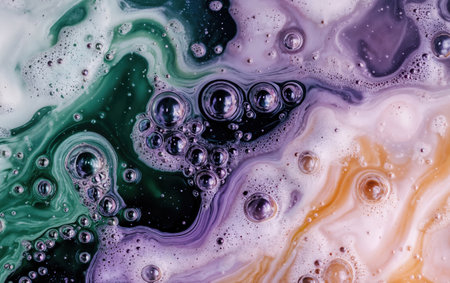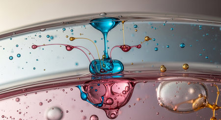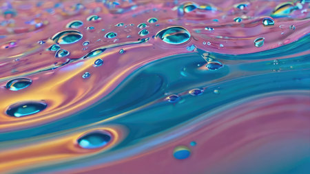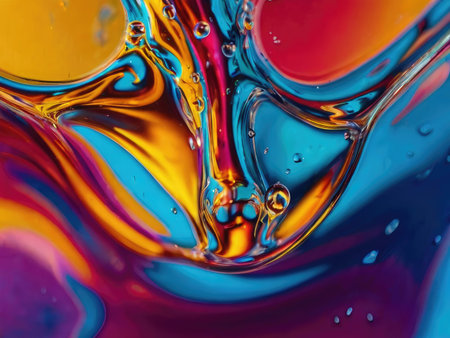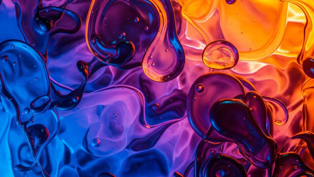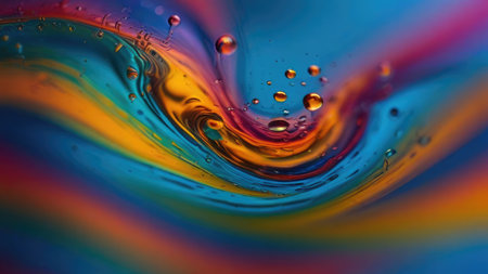 showing macro view of colorful oil and water droplets interacting within a clear liquid medium creating abstract shapes and patterns with...