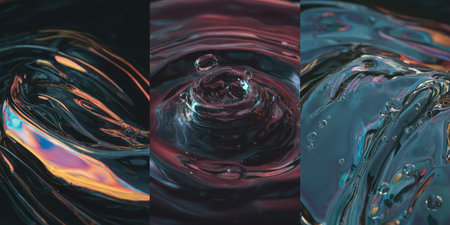 Three panels of liquid in dynamic motion with swirling, iridescent colors, and bubbles