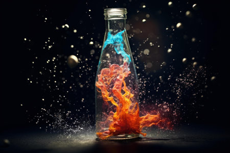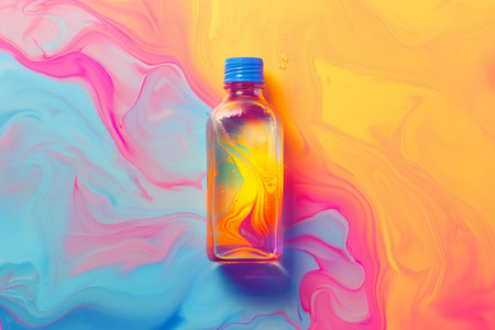 Transparent bottle sits against a background of swirling rainbow hues, creating a lively abstract scene