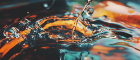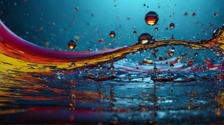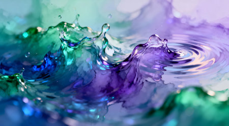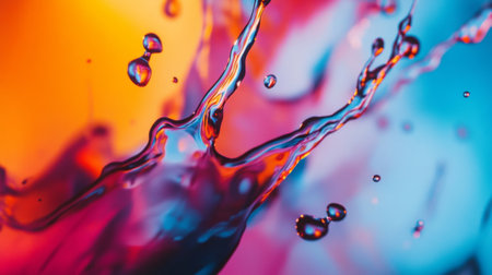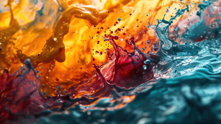 A high-speed capture of liquid splash in mid-air, displaying vibrant colors and intricate textures. Ideal for themes of energy, fluid dynamics, and abstract art.