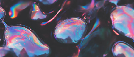 Vibrant rainbow bubbles reflecting light on a dark backdrop with prismatic effects