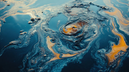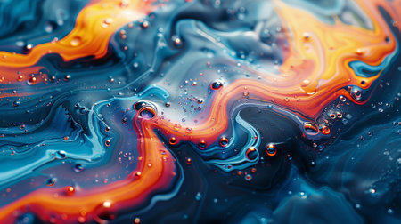 Macro view of swirling liquid with vibrant blue and orange hues and suspended bubbles.