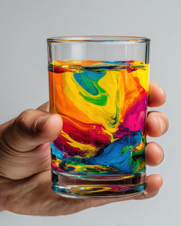 clean shot of hand holding glass filled with colorful liquid, isolated on bright background, strong contrast and room for text, Generative AI