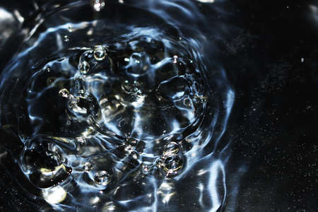 Water splash and drops on blue and dark water surface.
