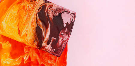 Soap with colorful peeling and splashes above pink background. Bath time concept. Top view banner with copy space