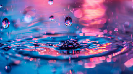 Macro shot of vibrant water droplets splashing, illuminated with neon pink and blue lights, creating a dynamic effect.