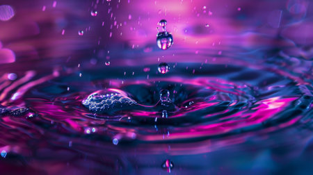 A mesmerizing close-up of water droplets in motion, captured with purple and pink lights. The dynamic scene creates a captivating and abstract visual effect.
