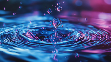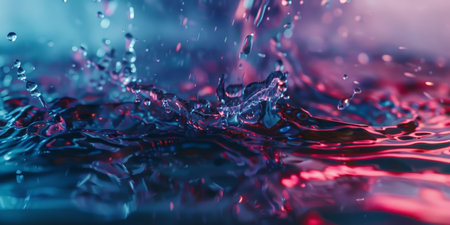 A close-up of a water droplet splashing with neon blue and pink lighting, creating a mesmerizing and abstract scene. Ideal for themes of energy, movement, and creativity.
