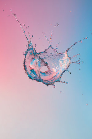 AI Generated. Water Splash with Iridescent Hues on a Pink and Blue Gradient Background