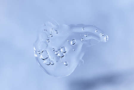 Drop of Fluid hyaluronic acid on blue. Cosmetics and healthcare concept closeup. Dose of serum or retinol with air bubbles. Flat lay. Luxury gel or beauty product presentation in macro