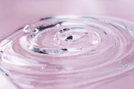 Sample of transparent shower gel on violet background, closeup