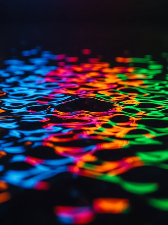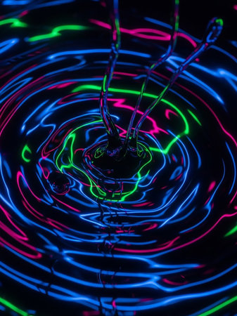 (710) showing ripples of water disturbed by falling drops create concentric circles illuminated by vibrant neon pink, green, and blue light against a dark...