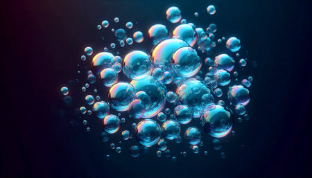 Vibrant rainbow bubbles reflecting light on a dark backdrop with prismatic effects