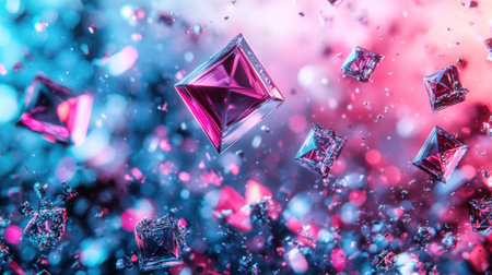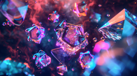 A digitally rendered image of geometric shapes, with sharp angles and reflective surfaces, floating in a colorful, abstract background.