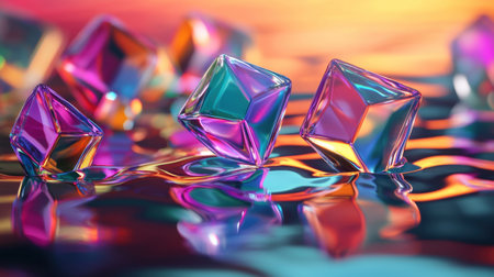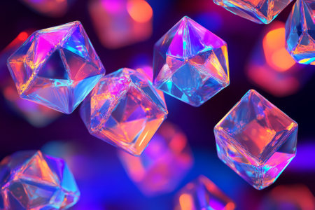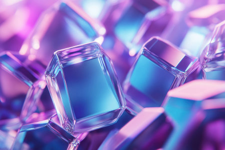 Abstract background of colorful glass cubes reflecting light with shades of blue and purple, ideal for modern design and creative projects