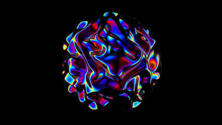 3D Abstract iridescent wavy sphere black background. Vibrant liquid reflection distorted ball. Neon holographic fluid distortion orb. Trendy smooth surface interference