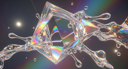 This artwork captures mesmerizing crystal waves with iridescent reflections and dynamic water splashes, showcasing a vibrant, abstract design.