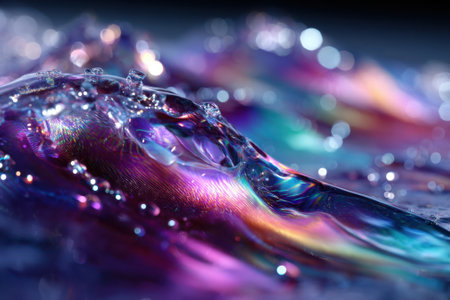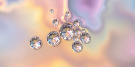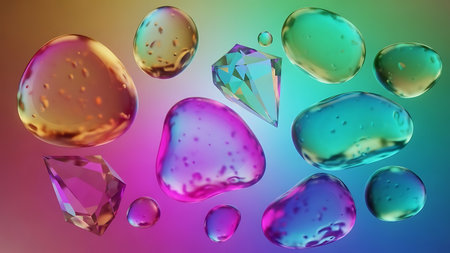 Close up of iridescent gems and liquid droplets against a pastel gradient background artful shot