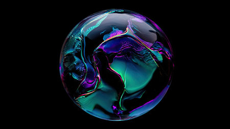 A spherical object with a reflective, iridescent surface is centered against a dark backdrop. The composition showcases dynamic color transitions and highlights a complex texture. The image evokes a sense of depth and luminosity, suitable for artistic, scientific, and design projects. The object appears to float in a void.