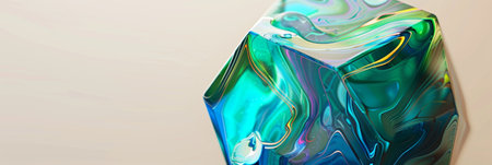 A paperweight shaped like a hexagon with vibrant hues of blue and green swirling together in an abstract pattern