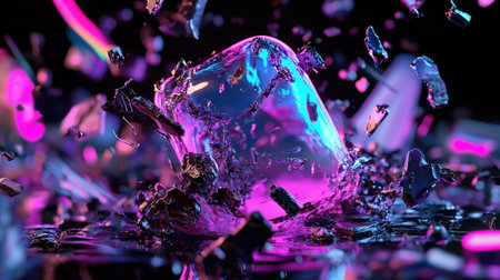 This striking abstract image features shattered glass fragments illuminated by colorful neon lights, creating a vibrant and dynamic visual experience.