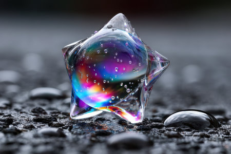 A vibrant glass star with bubbles rests on a reflective surface as twilight colors create enchanting patterns.