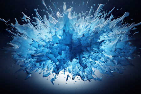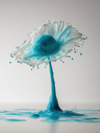 Vivid splash captures the moment a blue liquid rises dramatically above a surface, creating an artistic shape with fluid dynamics in a controlled setting.