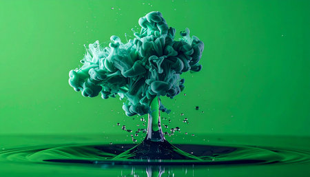 A vibrant plume of green ink erupts in water, creating a dynamic, tree-like cloud. The powerful impact sends ripples across the surface, capturing a moment of chaotic creation and abstract beauty. This image is perfect for concepts of growth, energy, and environmental science.