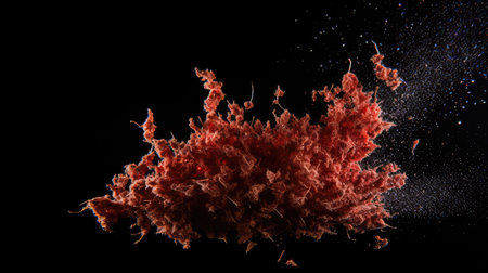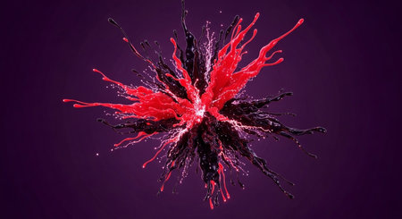 A mesmerizing abstract image showcasing a powerful red and black liquid explosion against a deep purple background.
