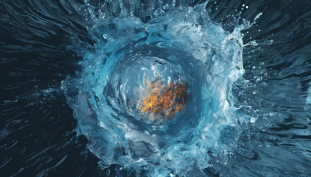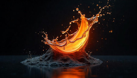 A stunning splash of water illuminated by an orange element creates a dynamic scene. The contrast of colors and fluid motion evokes energy and vibrance.