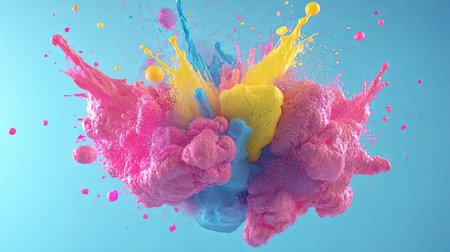 This captivating image features a colorful explosion of powder in bright shades, creating a dynamic and visually striking effect against a blue background.