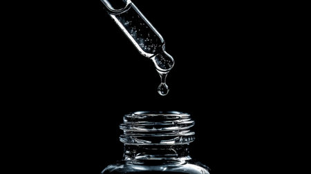 This captivating image features a close-up view of a dropper releasing a single water drop over a clear glass bottle, set against a stark black background.