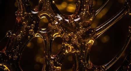 A realistic macro of a golden viscous liquid structure with bubbles on a dark bokeh background