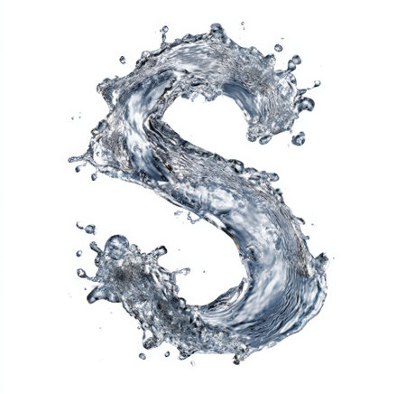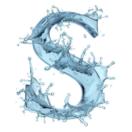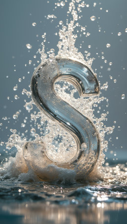A stunning glass letter S emerges dramatically from a splash of water, creating a captivating visual spectacle. The interplay of light and water droplets enhances the elegance of the letter, symbolizing creativity and fluidity.