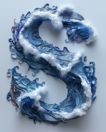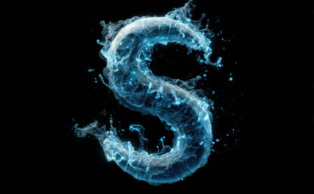 Letter S made of water. Font with splashes and drops of blue liquid. Typographic symbol with jet and splash. Marine concept of freshness, fluidity and the sea. AI Generated