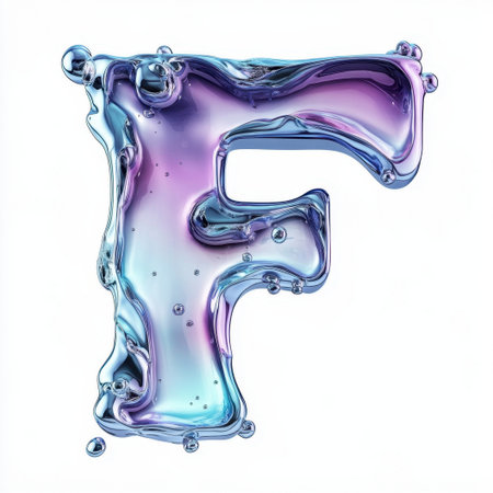 A striking liquid letter F, crafted from a glossy material with a blend of purple and blue hues, surrounded by small bubbles. This design embodies creativity and fluidity, perfect for contemporary branding or artistic projects
