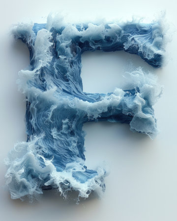 Capital letter F made of blue water splashes or ice on light background. Scrapbook activity. Generative AI.