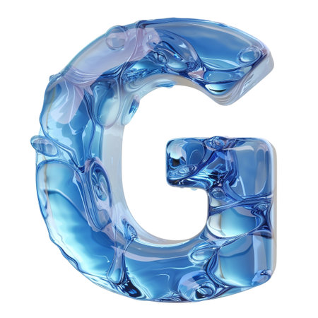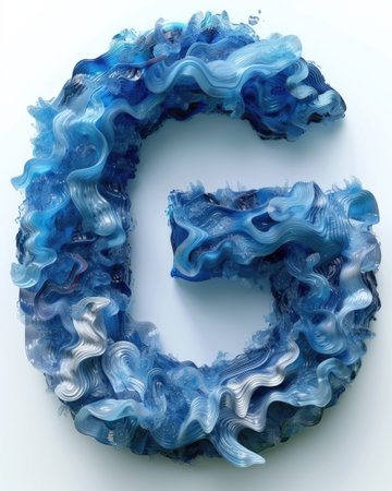 Capital letter G made of blue water splashes or ice on light background. Scrapbook activity. Generative AI.