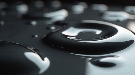 A glowing blue "S" made of water against a black background. Splashes and droplets create a visual effect